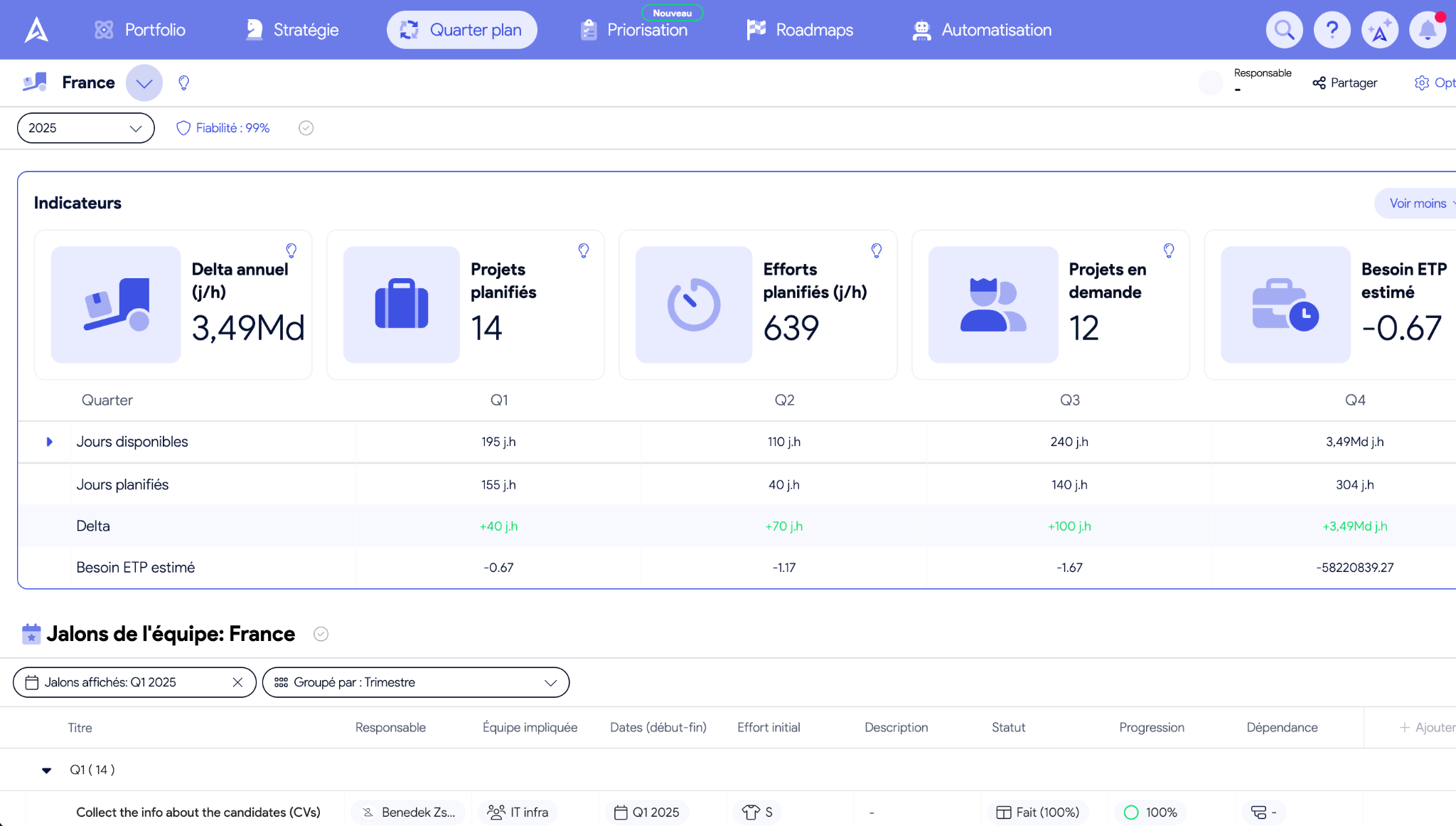 C'est le pivot de la méthode du quarterly planning. AirSaas permet de visualiser concrètement que "80 jalons dans le quarter, ça donne par exemple 800 jours pour les équipes, et nous n'avons pas 800 jours disponibles dans l’équipe". Cette fonctionnalité permet d'arbitrer factuellement entre le Run (maintenance) et le Build (projets).